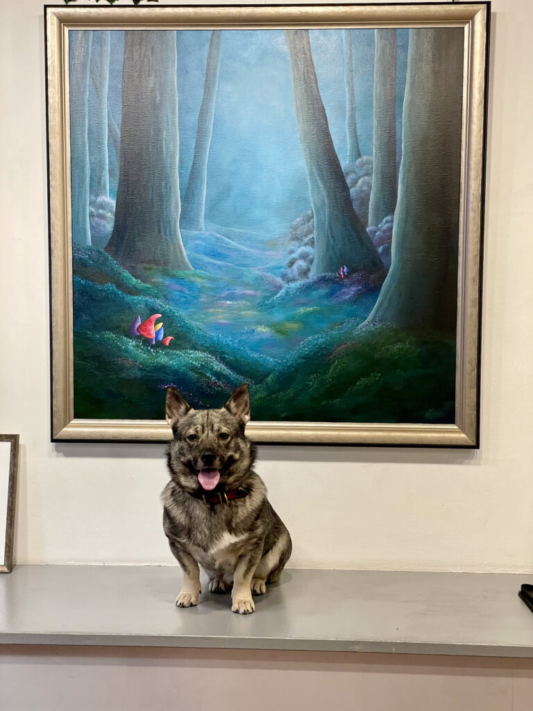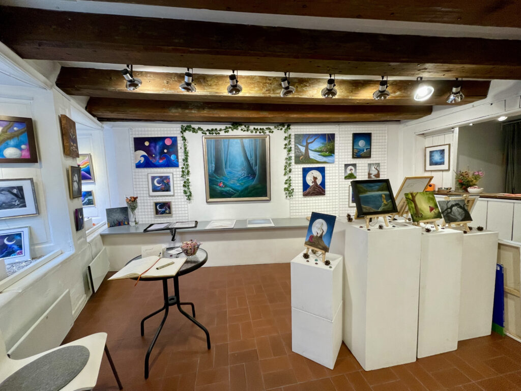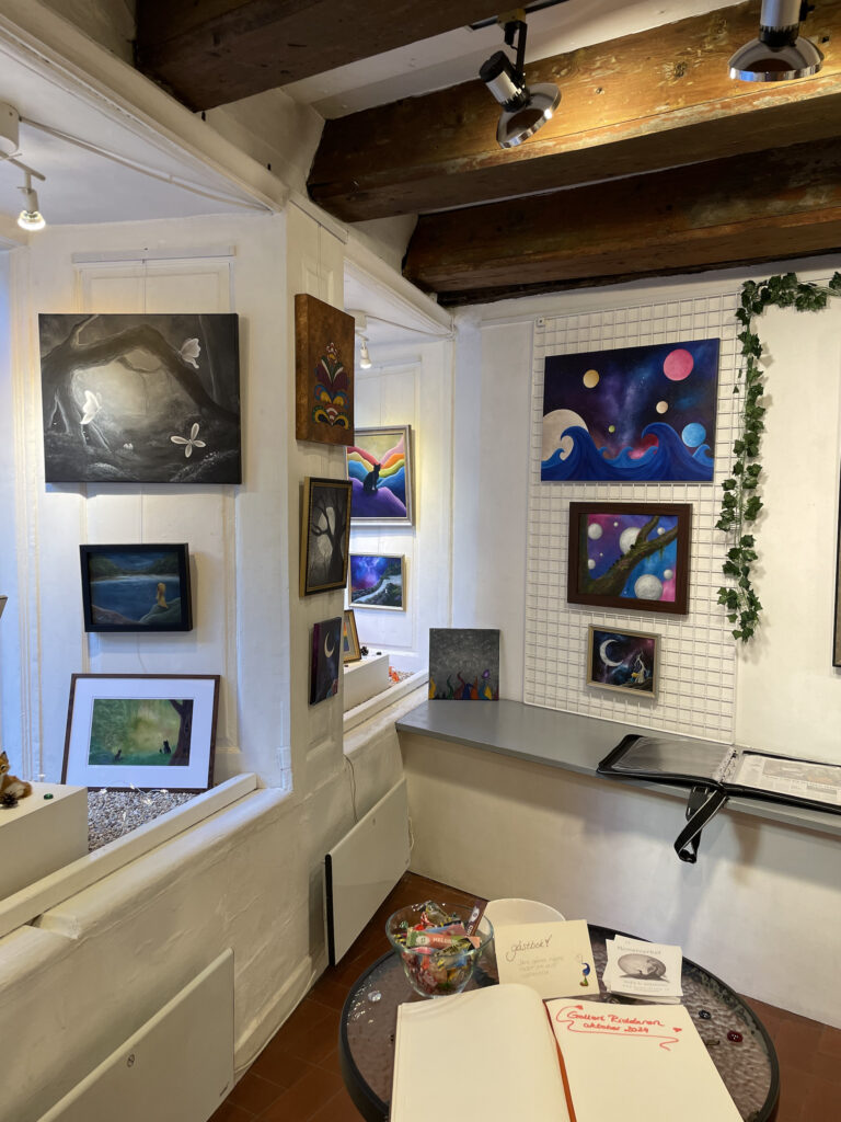 Här är några bilder från tidigare utställningar i Stockholms Pride, Larssons Lada, i skogen och utsikten från utställningen i Los Angeles. Under sin inspirationsresa i Europa målades det även på tåg, i parker och slott där hon fick höra om olika länders väsen och måla sin väg genom Europa. Hon har även haft en utställning i Gamla Stan där över 30 målningar hittade sina hem och på flera andra gallerier i Stockholmsområdet.